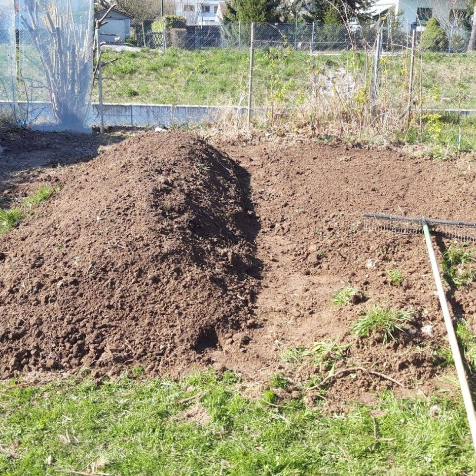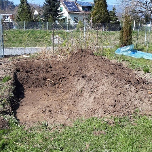 Nach der Bodenvorbereitung und dem Aushub kann man ein feinmaschiges Drahtnetz als Schutz vor Mäusen darin befestigen. Hier wurde zuerst etwas Häkselgut ins Beet gegeben. Anschliessend wurden Äste und ähnliches Material reingeschichtet und die Grasnarben draufgelegt. (Idealerweise ergänzt man noch mit Komposterde, diese war aber gerade nicht vorhanden.) Danach wurde das Aushubmaterial als Hügelbeet aufgeschichtet. Und bald wird fröhlich bepflanzt...